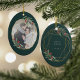 Elegant photo Christmas ornament features a favorite photo encircled by a faux gold foil oval geometric frame with green watercolor foliage and red berries. Add your names and the year, or a custom message, to the reverse side in a matching delicate geometric frame.