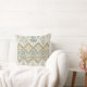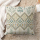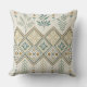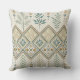 A seamless pattern throw pillow blending geometric precision with botanical charm in earthy tones of cream, gold, green, and teal. The design features a bold zigzag band of intricate diamonds filled with radiating lines, floral-like motifs, and snowflake accents, framed by leafy branches and feathery fronds. Subtle background diamonds add depth and texture, evoking the look of hand-crafted textiles. Ideal for folk art fans, boho décor enthusiasts, and nature-inspired design lovers. Perfect for rustic occasions, artisan gifts, seasonal projects, or cultural-inspired décor.
