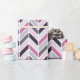 Geometric chevron pattern gift wrap in accents of purple, pink and grey.