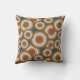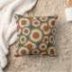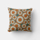 This throw pillow features a geometric pattern of overlapping concentric circles in rust, tan and cream on a teal background for a modern, contemporary look.