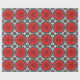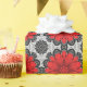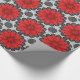 Wrapping paper in a geometric daisy pattern in deep red / crimson on a black and white patterned background