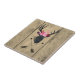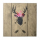 A ceramic tile with a black deer head with large antlers and made with geometric lines and wearing a pink floral crown. Crossed arrows below. Rustic and trendy design.The background is a digital image of light brown coloured wooden planks.