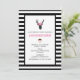 A birthday party invitation with a black deer head made with geometric line and wearing a pink floral crown. Rustic and trendy design. The background is black and white stripes. A white frame with a pink border layered over top.