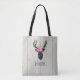 A personalised tote bag with a black deer head made with geometric lines and wearing a pink floral crown. Rustic and trendy design. The background is a digital image of some wood.