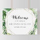 This geometric destination green wedding welcome sign is perfect for a tropical wedding. The design features hand-painted watercolor green palm and banana leaves neatly arranged into beautiful bouquets, adorning a gold geometric frame.