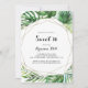 This geometric destination sweet 16 birthday party invitation is perfect for a tropical birthday. The design features hand-painted watercolor green palm and banana leaves neatly arranged into beautiful bouquets, adorning a gold geometric frame.