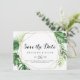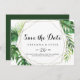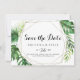 This geometric destination tropical horizontal wedding save the date is perfect for a greenery wedding. The design features hand-painted watercolor green palm and banana leaves neatly arranged into beautiful bouquets, adorning a gold geometric frame.