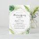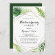 This geometric destination tropical housewarming party invitation is perfect for a simple new house celebration. The design features hand-painted watercolor green palm and banana leaves neatly arranged into beautiful bouquets, adorning a gold geometric frame.