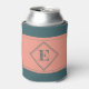 This can cooler design features a centred geometric double diamond shape in teal over a pale salmon background. Personalise the text field with an initial letter or click customise to select a typeface colour, size, and style your prefer.