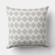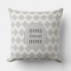 Beautiful grey geometric diamond pattern on an almost white background. The front side of the pillow has a big grey dot with the text: Home Sweet Home.