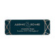 A modern wedding return address label, features a "faux foil" gold rose geometric pattern over a dark turquoise background. All your details are spelled in a beautiful modern typo.