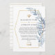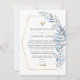 Simplistic blue eucalyptus leaves in a gold geometric frame reduced wedding guest list announcement card. In these uncertain times, it can happen that you may have to hold a smaller wedding than originally planned. This announcement card will take away the awkwardness and take a load off your mind! You can furthermore provide an option to join you for a virtual ceremony.