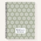 Personalised stylish notebook with your name, the title and date in elegant offblack calligraphy features a geometric floral pattern in sage green and offwhite. Perfect for sketching or keeping track of notes and ideas. Exclusively designed for you by Happy Dolphin Studio!