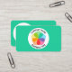 A business card template with a geometric abstract motif made up of five overlapping semi-transparent elliptical shapes in five different colours arranged around a centre point, creating a pentagon with a geometric flower like shape in the centre. The symbol is placed in a white circle with curved text company name and business type. Name and other contact details on the reverse using the white circle panel without the symbol with the name and job title placed inside and arranged to the left side.