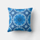 Throw pillow in a geometric flower pattern in bright cerulean / sea blue on a light blue background, accented with navy