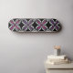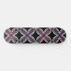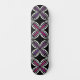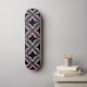 Skateboard with a unique geometric flower design in purple, fuchsia and black.