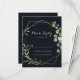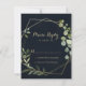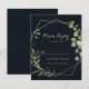 These geometric gold blue green calligraphy RSVP cards are perfect for a modern wedding. The design features hand-painted beautiful green leaves in a dark blue background, adorning a gold geometric frame.