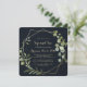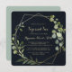 This geometric gold blue green calligraphy sip and see invitation is perfect for a simple meet the baby party. The design features hand-painted beautiful green leaves in a dark blue background, adorning a gold geometric frame.