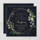This geometric gold blue green front and back wedding invitation is perfect for a modern wedding. The design features hand-painted beautiful green leaves in a dark blue background, adorning a gold geometric frame.