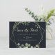 This geometric gold blue green horizontal wedding save the date is perfect for a modern wedding. The design features hand-painted beautiful green leaves in a dark blue background, adorning a gold geometric frame.