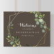 This geometric gold brown green wedding welcome sign is perfect for a rustic wedding. The design features hand-painted beautiful green leaves in a brown background, adorning a gold geometric frame.
