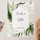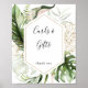 This geometric gold tropical green cards and gifts sign is perfect for a destination wedding or bridal shower. The design features hand-painted watercolor gold and green palm and banana leaves with pink flowers bunched into bouquets, adorning a geometric frame.