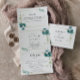 This geometric gold tropical greenery wedding invitation is perfect for a rustic wedding. The design features predominantly hand-painted watercolor green foliage coupled with gold flowers, adorning an elegant geometric frame.