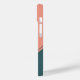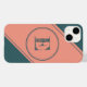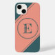 This phone features a centred geometric double circle in teal over a pale salmon background. Personalise the text field with an initial letter or click customise to select a typeface colour, size, and style your prefer.