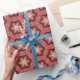 Modern wrapping paper design featuring white geometric flowers and shapes on a light red background.