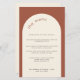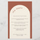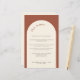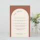 This modern wedding menu with minimalistic font is perfect for a modern wedding, minimal wedding or any other celebration. This menu template features a terracotta background and and an arch in cream white. All text elements and colours of this wedding menu card can be customised.