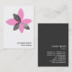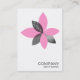 A business card template with a geometric abstract plant or flower motif made up of leaf like shapes, four of which are solid colour and three are semi-transparent and texture filled. Company details on the front with name and contact details on the back. Can be adapted to a variety of businesses and other uses. Can also be adapted for use more as a profile card by removing or swapping the company and personal name details.