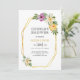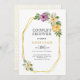 Gold foil polygon geometric floral wedding couples shower invitation. It features a gold polygonal frame with your text and a bouquet of watercolor flowers on the upper right corner and a flower at the left bottom. The back includes a polka dot pattern.