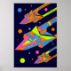 vibrant, geometric illustration showcasing three angular spaceships soaring through a dark blue starry expanse. The ships feature a faceted design with bold blocks of colour including hot pink, blue, orange, and neon green. Each vessel trails a bright neon green exhaust. Scattered throughout the background are numerous circular forms in orange, hot pink, and bright yellow, representing planets or cosmic elements, adding to the dynamic and colourful scene. The artwork has a distinct retro-futuristic and psychedelic style with strong outlines and a flat, graphic quality. (designed by freepik)