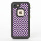 Protect your iPhone 7 with a waterproof, shock absorbing LifeProof® case featuring a geometric purple and white meander pattern with a window to showcase the Apple logo on the back of the phone. This bold regal purple and white pattern is an original ornamental design. Purple diamonds with white borders are surrounded by royal purple meanders which angle around them. White zigzags separate the winding purple paths and offset diamonds.