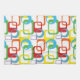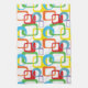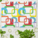 The colourful graphic geometric pattern on this tea towel features rounded rectangles and circles with offset cutouts, reminiscent of mid century modern design, has been updated with a lively palette of various colours.