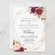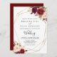 This geometric rustic boho floral front and back wedding invitation is perfect for a simple wedding. The design features pink, purple, red, and burgundy watercolor peonies clustered into elegant bouquets with green foliage, embellishing a gold geometric frame.