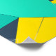 An abstract geometric design featuring a bold central cyan or teal hexagon, framed by a complex mosaic of brightly coloured triangles and polygons. The surrounding shapes utilise a palette of yellow, dark navy blue, and various teal shades. Some of the darker and teal sections incorporate subtle linear patterns and thin white vector lines, adding texture and depth to the otherwise flat, clean design. This piece evokes a modern, sharp, and dynamic energy.