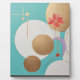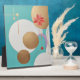 A gentle harmony of circles, lines and flowers blooms on this canvas. Golden shapes reflect strength and balance, while a bright coral flower brings warmth and emotion. The shades of turquoise, white, purple and gold dance together, combining geometry and poetry, precision and passion
