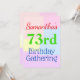 This simple birthday party invitation design features a message like "Samantha’s 73rd Birthday Gathering", where the name and birthday number can be customised. It also features a fun geometric-themed background. The event details on the back can be personalised. It could be used to invite people to somebody’s seventy third birthday celebration or birthday party. [~Z0000311]