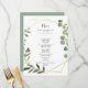 This geometric tropical green leaves Spanish dinner menu card is perfect for a modern wedding. The design features hand-painted beautiful green leaves, adorning a gold geometric frame.