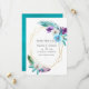 Turquoise and purple watercolor tropical leaves wedding save the date with gold geometric frame and elegant typography.