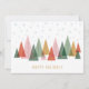 A minimalist design showcasing a colourful forest of stylised, geometric trees under falling snowflakes. The bright colours and modern shapes create a joyful and festive holiday atmosphere.