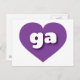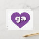 This postcard features a shapely and vibrant purple heart containing the bold, white, rounded lower case letters ga, a playful abbreviation for Georgia, the peach state. The reverse side of the postcard is blank, awaiting your personalised text or handwritten sentiments.