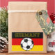 The flag of Germany, tricolour, displaying the national colours of Germany: black, red, and gold. In the middle there is a sketch / scribble style picture of a black and white, soccer ball / football.