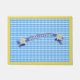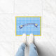 German inspired door mat done in a blue and white diamond check pattern, with a yellow border. Graphics of a blue banner, across the middle is decorated with an Edelweiss bloom, on each side. White custom text on the banner reads Welcome in German, Willkommen, and can be changed to read what you want.