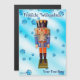 A traditional German wood nutcracker depicting a military officer with a blue and orange uniform. The nutcracker is superimposed on a blue background image with snowflakes. German-language text reading "Fröhliche Weihnachten" (Merry Christmas) also appears. Add your own additional text.