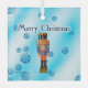 A traditional German wood nutcracker depicting a military officer with a blue and orange uniform. The nutcracker is superimposed on a blue background image with snowflakes. Text reading "Merry Christmas" also appears.