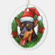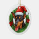 Celebrate the holiday season with our festive German pinscher Christmas wreath ornament. This charming ornament features a vibrant illustration of a green Christmas wreath, with the adorable face of a German pinscher wearing a cheerful red Santa hat at the centre. Perfect for dog lovers and holiday enthusiasts, this delightful decoration adds a touch of festive cheer to any Christmas tree. Made from high-quality materials, it ensures lasting beauty year after year. Hang it on your tree or gift it to friends and family for a heartwarming holiday surprise.