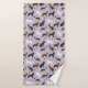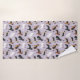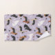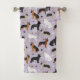 Cute German Shepherds in black and tan, black and red, black and silver, white and back colour coats sit and stand with scattered dog bones and paw prints on a light purple background.