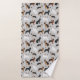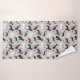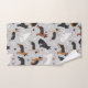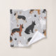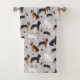 Cute German Shepherds in black and tan, black and red, black and silver, white and back colour coats sit and stand with scattered dog bones and paw prints on a light grey background.